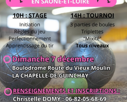 Actualité nationaleLe Comité Sportif Bouliste 71, pour la seconde fois de la saison, organise une animation "Journée Féminines et Mixité" qui s'adresse à tout le monde : joueuses, joueurs, débutants et confirmés.