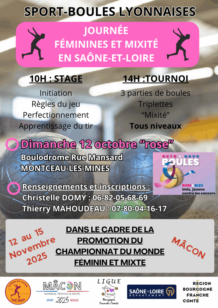 Pour ce faire, nous proposons une animation solidaire au boulodrome de Montceau-les-Mines par le biais d’une journée féminines et mixité le dimanche 12 octobre « rose ».