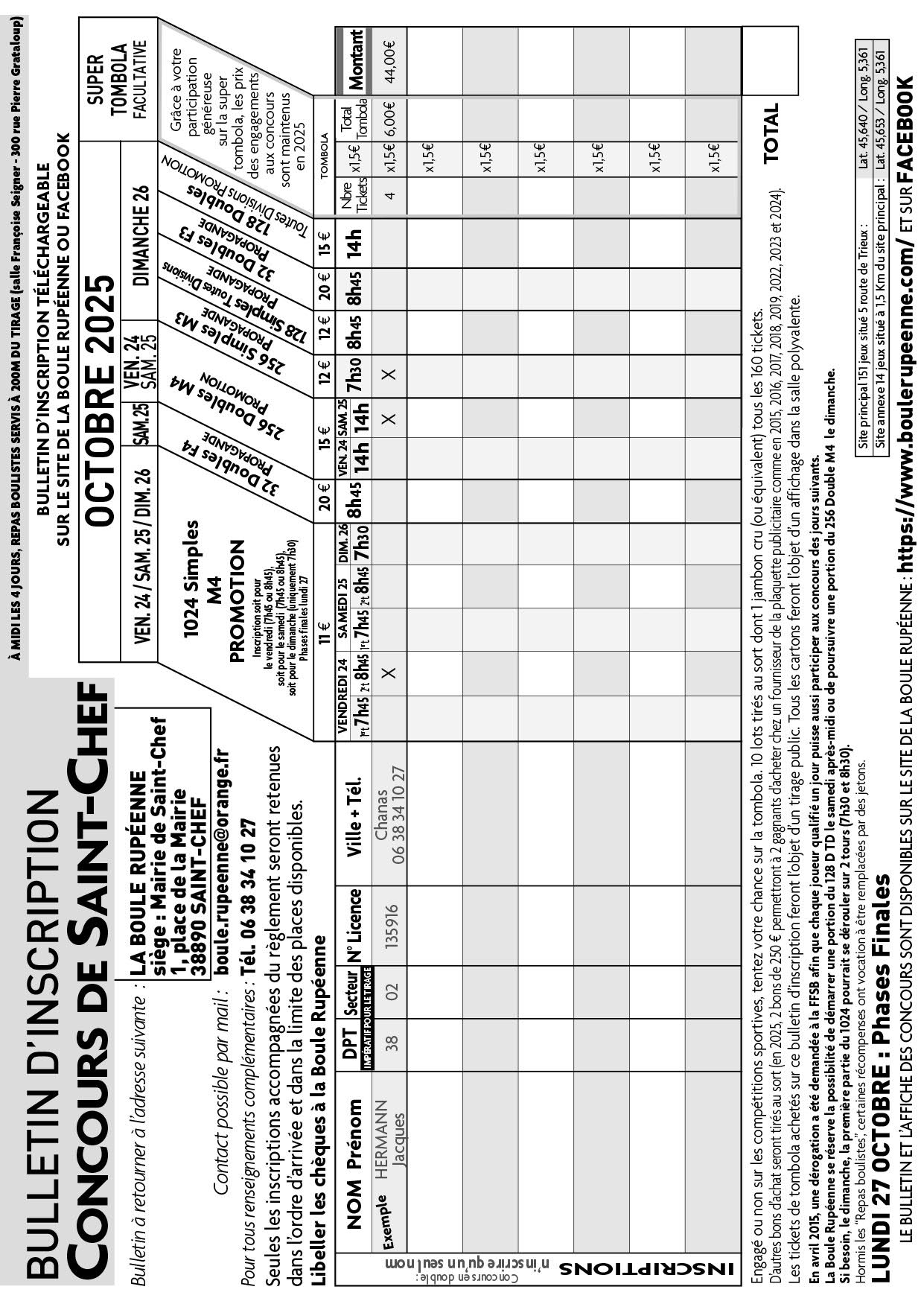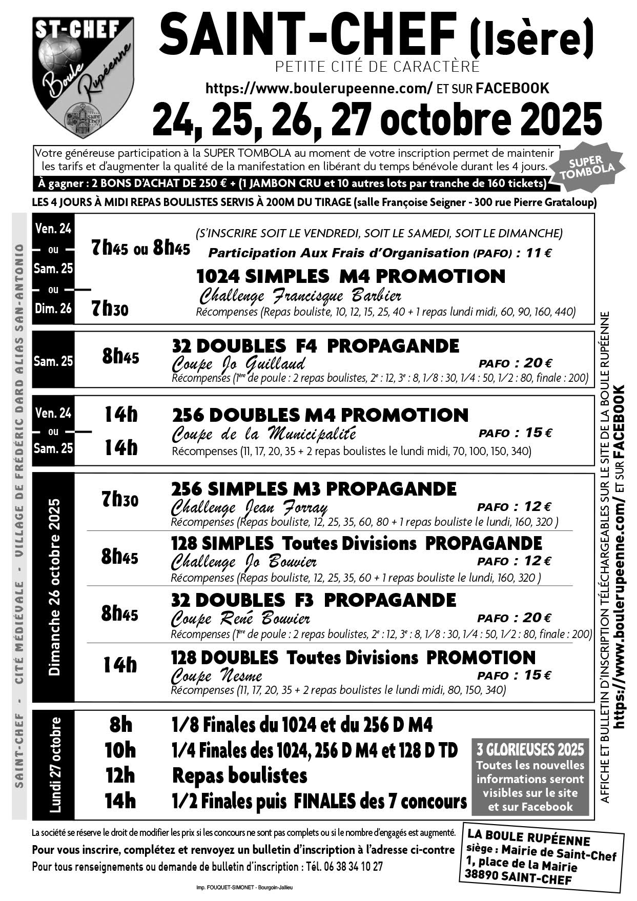 Fin octobre, les fêtes boulistes de Saint-Chef en Isère, battront leur plein (2 à 3000 joueurs, 800 repas chaque jour …) dans une petite ville de 3800 habitants. Si le 1024 simples M4 est le concours roi, il y en a pour toutes les catégories.
